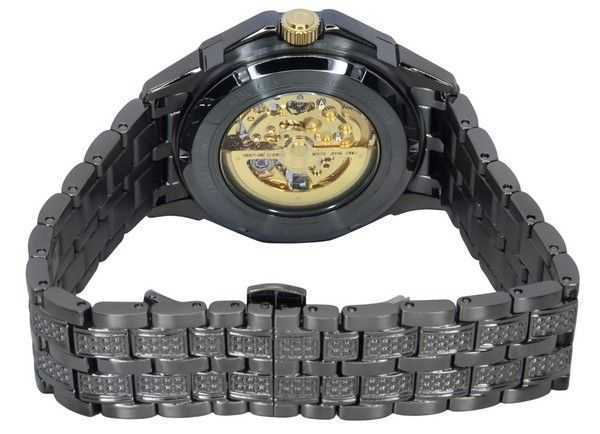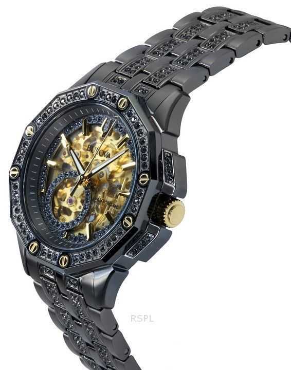 Bulova Octava Crystal Accents Stainless Steel Skeleton Gold Dial Automatic 98A293 Mens Watch