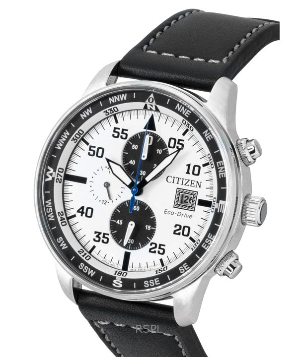 Citizen Eco-Drive Aviator Chronograph Leather Strap White Dial CA0880-07A 100M Men's Watch