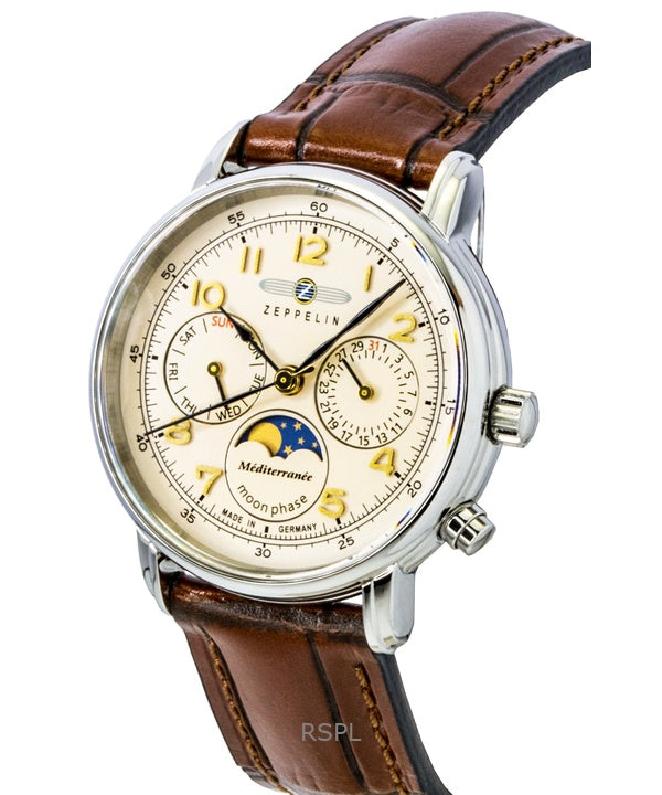 Zeppelin Mediterranee Moonphase Leather Strap Champagne Dial Quartz 96375 Men's Watch